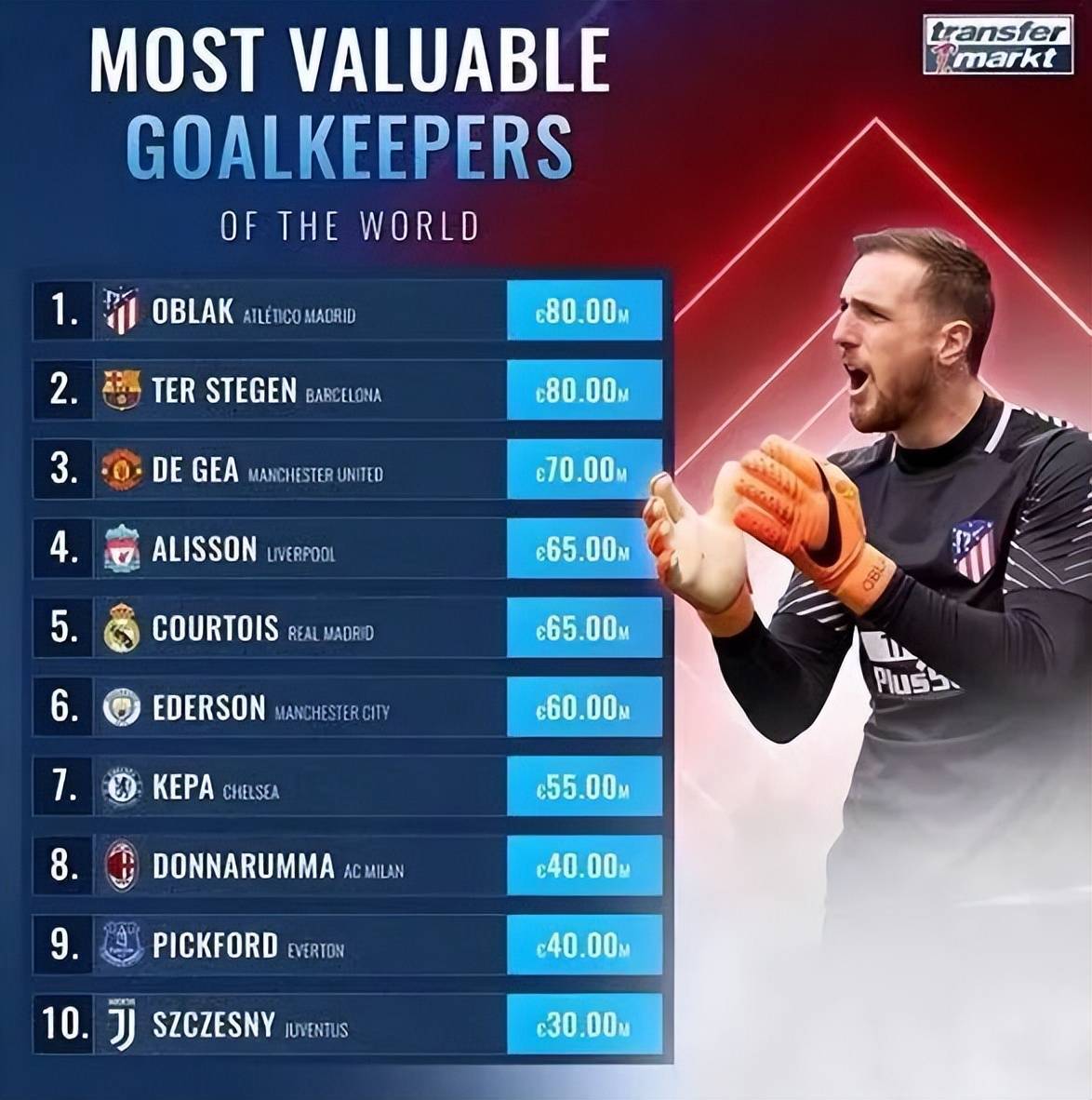 当今足坛门将实力金字塔:顶尖一档的只有5人